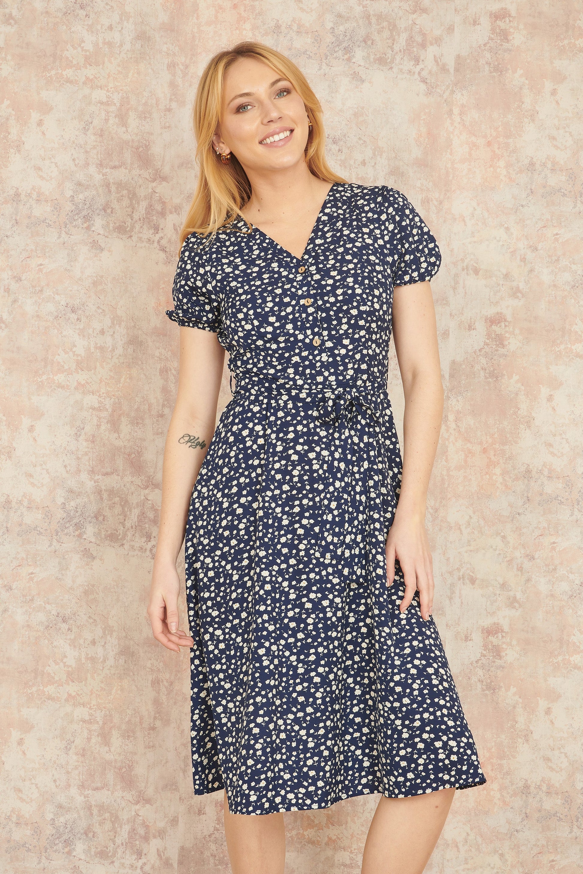 In a cool geo print this nod to retro is perfect for summer daytime dressing. With a button down design, collared neckline and tie at the waist, it's a mega flattering fit. The knee length hemline and pockets really make this dress something you will wear from work to weekend invites.