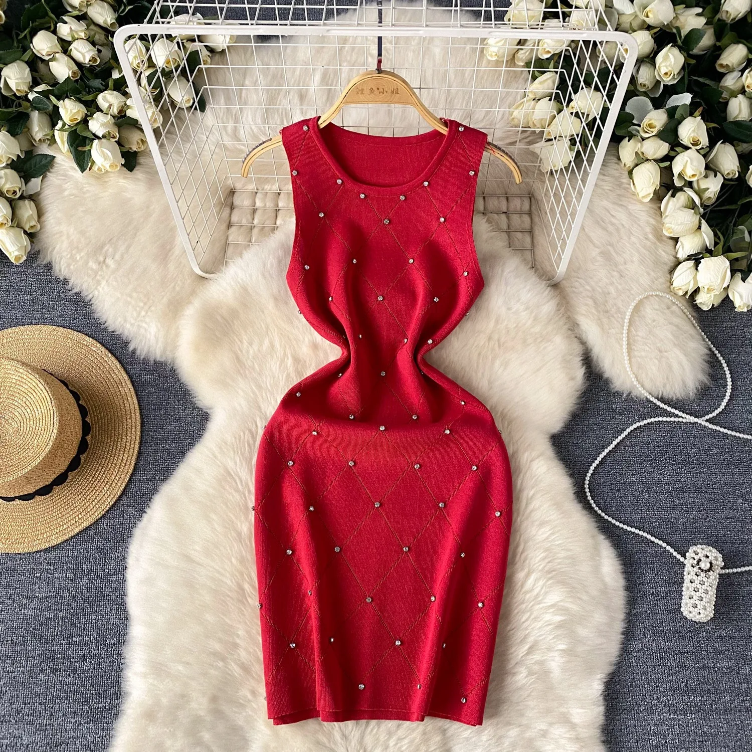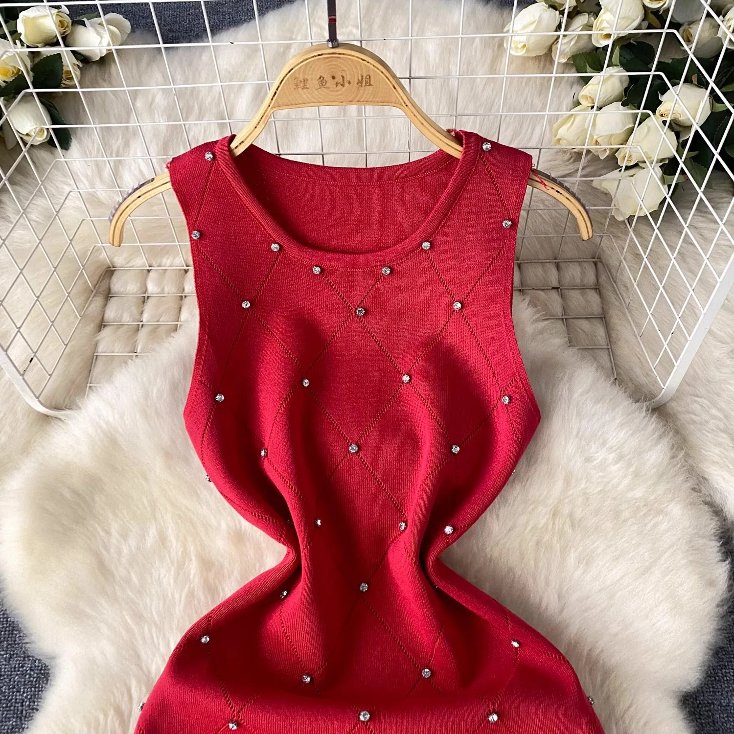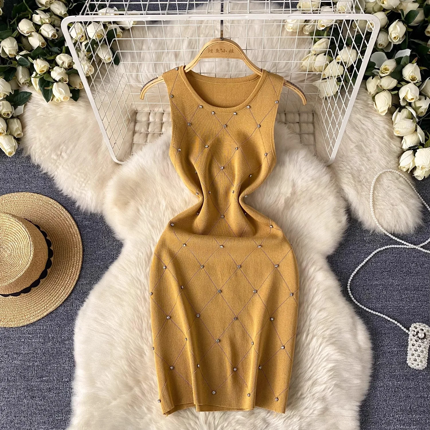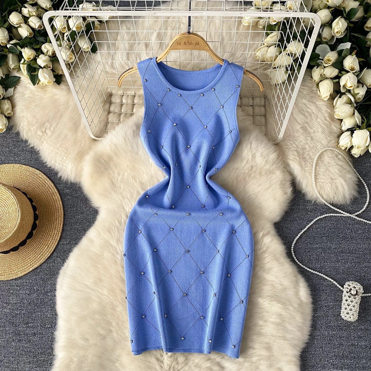YuooMuoo Hotsweet Beading Knitted Mini Dress Women Sleeveless Slim Bodycon Summer Dress Streetwear Lady Outfits Tank Dress